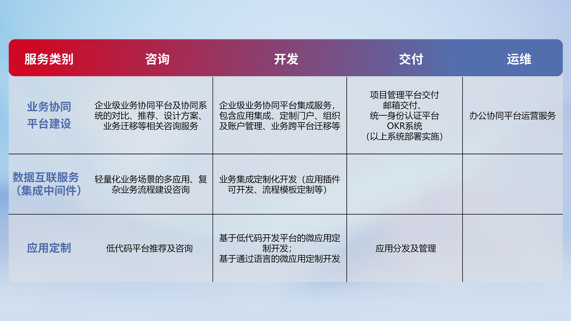 针对钉钉、、、、企微、、、IDaas等平台级产品提供产品的规划、、方案、、交付、、定制化开发等服务,,实现如统一协同办公、、智能客户服务、、、、混合会议管理、、、智能数据查询、、、等业务场景,,,,实现数字化转型。。。