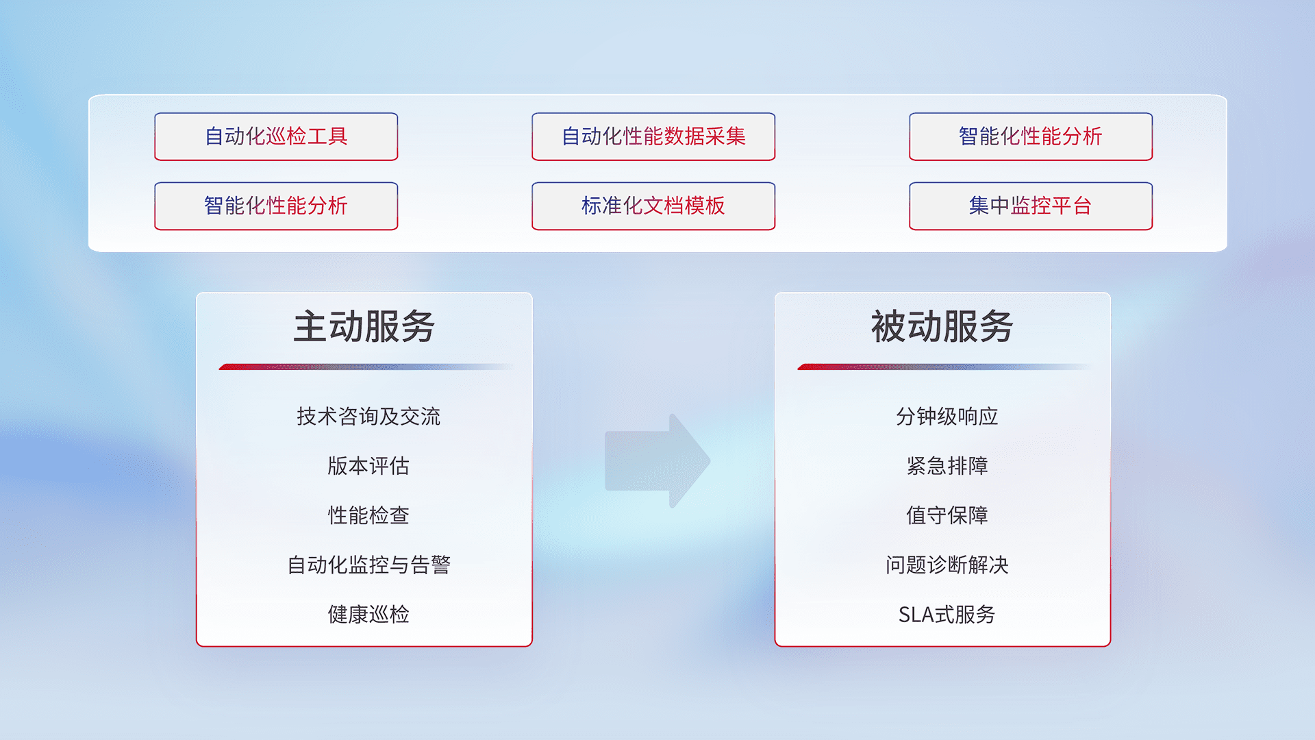 智能化工具和标准化文档,,,,保障服务质量,,提供主动服务(包含技术咨询、、版本评估、、、性能检查、、、、自动化监控与告警、、、、健康巡检)和被动服务包含(分钟级响应、、、、紧急排障、、值守保障、、、、问题诊断解决、、、、SLA服务)。。